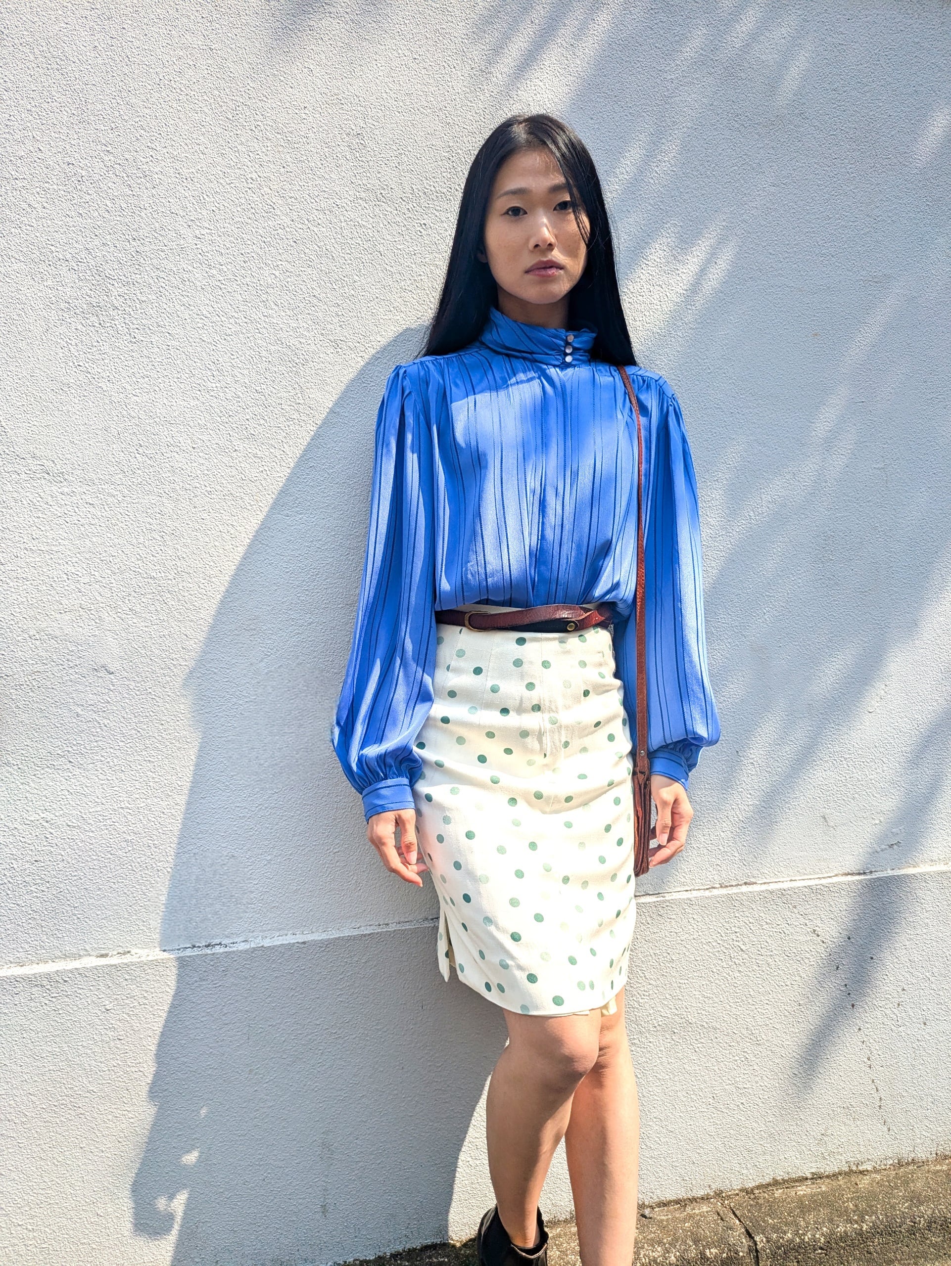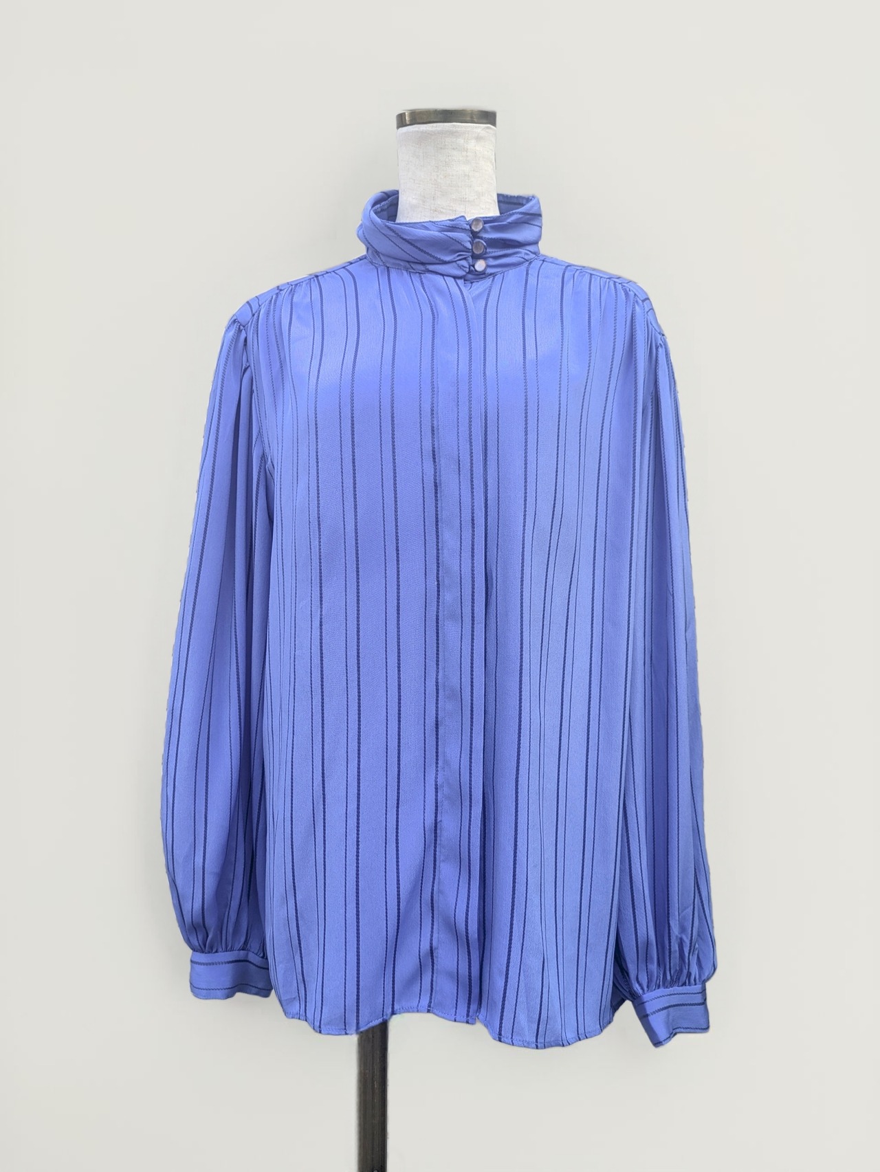 襟元のボタンと袖のドレープが綺麗なブラウスです。